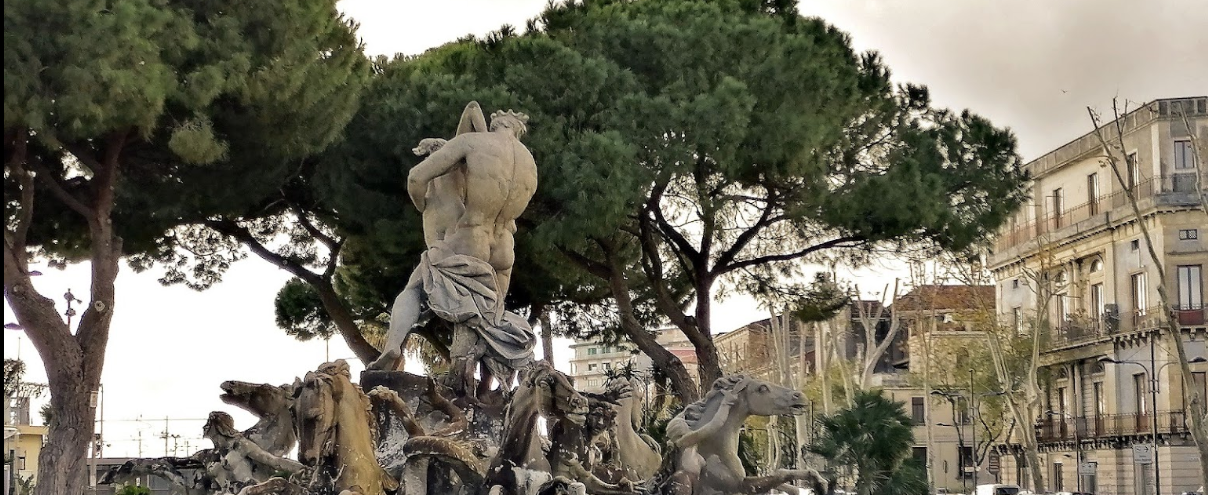 Vicino stazione centrale, Trovi una maestosa fontana. E' un opera che raffigura Plutone, alla guida di un cocchio trainato da cavalli e sirene, nell’atto di rapire Proserpina realizzata dallo scultore Giulio Moschetti. L'artista , si trasferì a Catania nel 1878 e qui rimase fino alla sua morte, avvenuta nel 1909 proveniva da Ascoli Piceno.